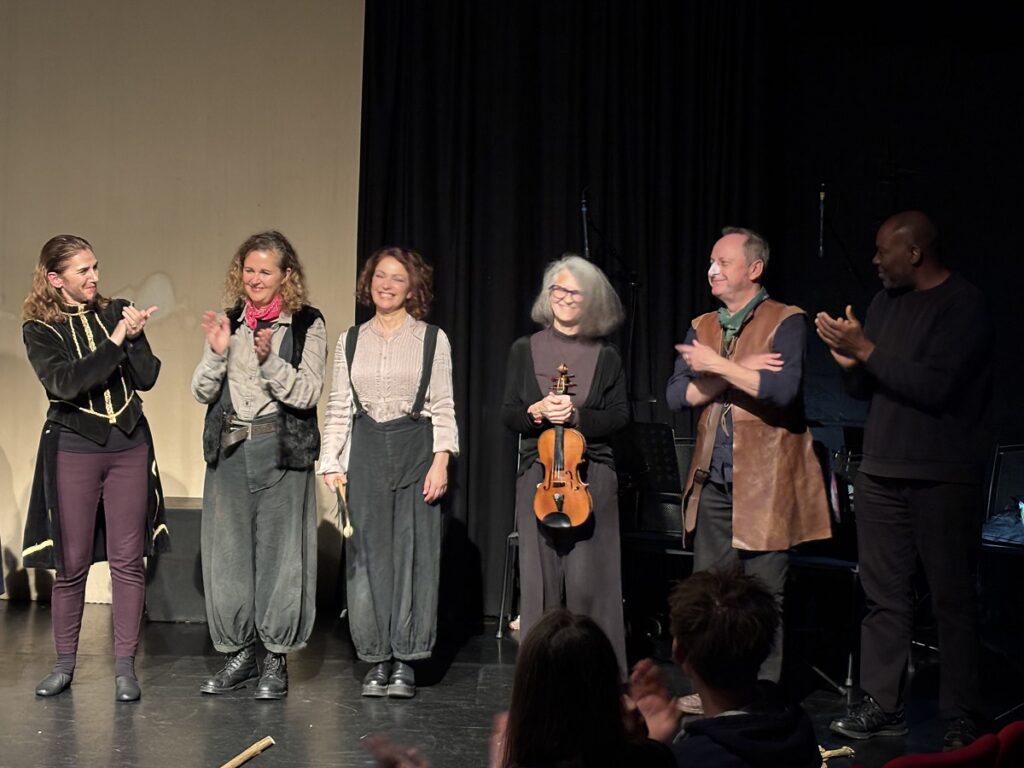 Composer Nick Godwin created an original music score for the chorus and musicians who won a special round of applause (see above) – Helen Brown (violin), Nick Godwin (guitar, bouzouki, bodhran, mandolin) and Ned Wilkins (bass ukelele).