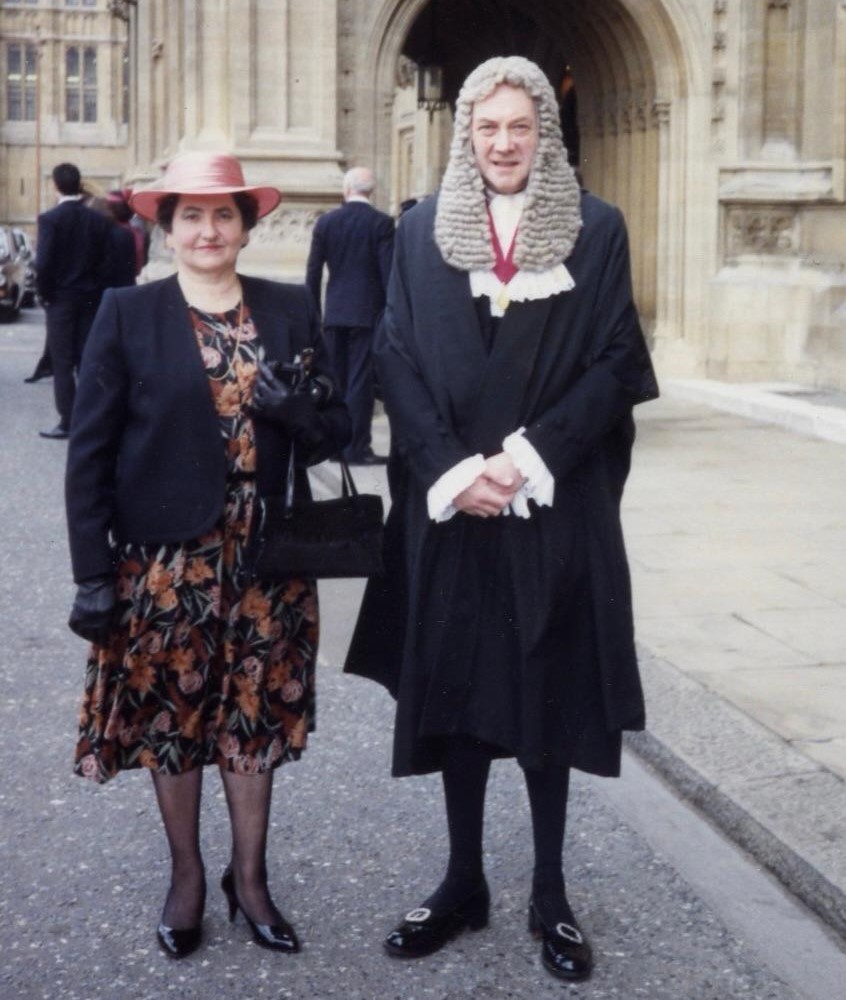 On the nomination of the Lord Chancellor, he became an honorary QC in 1991 — above with Rachel after the ceremony. This was followed by a knighthood in 1995.