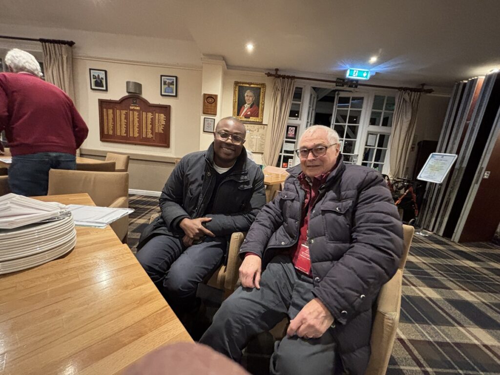 “We pride ourselves on making sure that any elderly resident we invite out is picked up at their home and then returned safely,” said Mr Moore (right) seen above signing up a new volunteer driver Larry Williams at the club’s February night out which was an evening meal with a Spanish theme at the Old Fold Manor Golf Club.