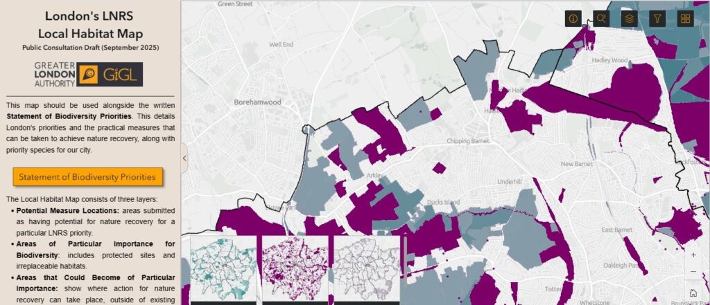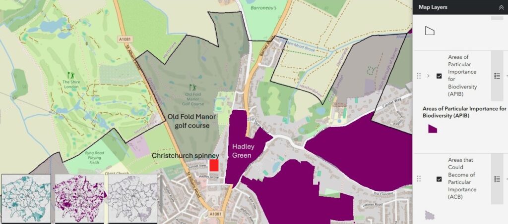 The plan above is based on an interactive map that is a key component of the draft London LNRS. It shows Areas of Particular Importance for Biodiversity (such as Hadley Green – purple on the plan) and Areas that Could Become of Particular Importance (such as Old Fold Manor golf course – sage green on plan).