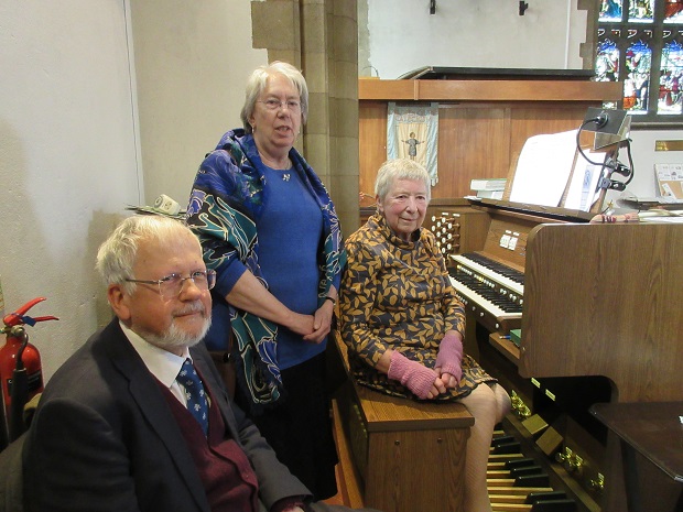 Janet (centre) is seen with the two organists who gave the recital, Ruth Lewis, and Jonathan Gregory.